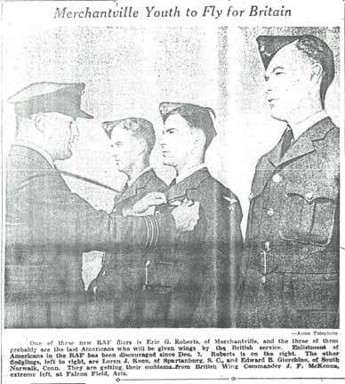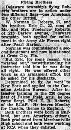 FIRST LIEUTENANT ERIC G. ROBERTS was still flying with the RAF on September 23, 1943 when the British air fleet bombed Hanover, Germany. In that raid, the first in a week due to foul weather, the United Press (fore-runner of UPI) reported "hundreds of RAF bombers dropped an estimated 200 tons of blockbusters and incendiaries on Hanover in a furious 30-minute raid. In the Hanover raid 26 RAF bombers and one fighter were lost". Eric Roberts had transferred to the United States Army Air Force shortly after the Hanover raid. He was reported missing on October 7, 1943. His body was later recovered. His death was reported in the October 18, 1943 edition of the Camden Courier-Post. |