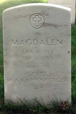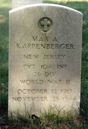 PRIVATE MAX A. KAPPENBERGER is memorialized on the Delaware Township War Memorial. Delaware Township changed its name to Cherry Hill in 1961. Max Kappenberger was born October 12, 1913 to Adolph and Anna Kappenberger in Zurich, Switzerland. Adolph Kappenberger came to America, settled in Philadelphia PA, and sent for his wife and infant son, who had been living with her father. Max and Anna Kappenberger arrived in Philadelphia aboard the SS Rugia, sailing out of Hamburg, on May 15, 1914, after 31 days at sea.. The Kappenberger family, reunited, lived at 3719 North 5th Street in Philadelphia at the time. The Kappenbergers remained in Philadelphia through at least April of 1930. Two sons, Adolph Jr. and Ernest, were born to the family When the census was taken in April of 1930, the family owned a home at 3943 Russ Street in Philadelphia. Adolph Sr. was working as a welder at a steel company, while Max Kappenberger had left school to work as a salesman in a produce store. He was still living in Philadelphia in the mid 1930s when he applied and was issued a Social Security card. At some point he married, and with wife Magdelen, moved to 210 State Street, in what is now Cherry Hill NJ. Inducted into the United States Army on November 26, 1943 in Philadelphia, he was assigned to the 26th Infantry Division. Private Kappenberger was killed in action on November 25, 1944 in fighting west of the Saar Canal. His body was returned home after the war, and on June 8, 1949 he was buried at Beverly National Cemetery in Beverly NJ. He now rests next to his wife Magdalen, who survived him until 1983. He was also survived by his parents and two younger brothers, Adolph and Ernest. |
