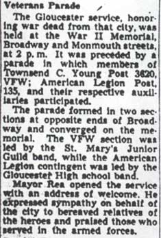 Gloucester City NJ has given 65 of its young men to our nation since 1917, a huge loss in proportion to the actual population of the town. Gloucester has honored its fallen heroes with a series of monuments on the east side of Broadway in the center of town. |