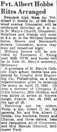 PRIVATE ALBERT C. HOBBS JR. was born in 1916 in Camden NJ to Albert C. and Mary Hobbs. The Hobbs family was living on Fillmore Street in Camden NJ in January of 1920. Albert Hobbs Sr. was then working at an engraving company. By April of 1930 the Hobbs family had left Camden, purchasing a house at 914 Somerset Street in Gloucester City NJ. Albert C. Hobbs Jr. was a graduate of St. Mary's Catholic High School in Gloucester City. He had married, and with his wife Viola had a son, Albert C. Hobbs III. Albert and Viola Hobbs made there home at 608 Sherwood Street in Gloucester City. He was working as a shop foreman for the Graphic Arts Engraving Company in Philadelphia when called to service on April 15, 1944. Private Albert C. Hobbs Jr. was killed in action on January 26, 1945 in action in Alsace at Kaysersburgh, near the Weis River. He was survived by his wife, son, parents, two brothers, Henry and Charles, and three sisters, Mary, Jean, and Jacqueline. Albert Hobbs was brought home in April of 1944. He was buried at New St. Mary's Cemetery in Bellmawr NJ. |