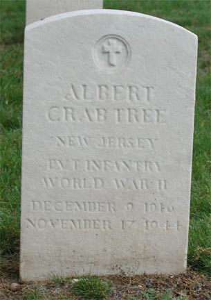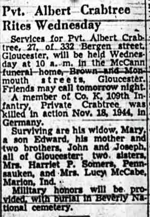 PRIVATE ALBERT CRABTREE, 28, of 332 Bergen Street in Gloucester City NJ, was killed in action on November 17, 1944, while fighting in Germany. He had been sent overseas in September of 1944. |