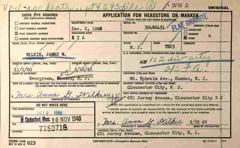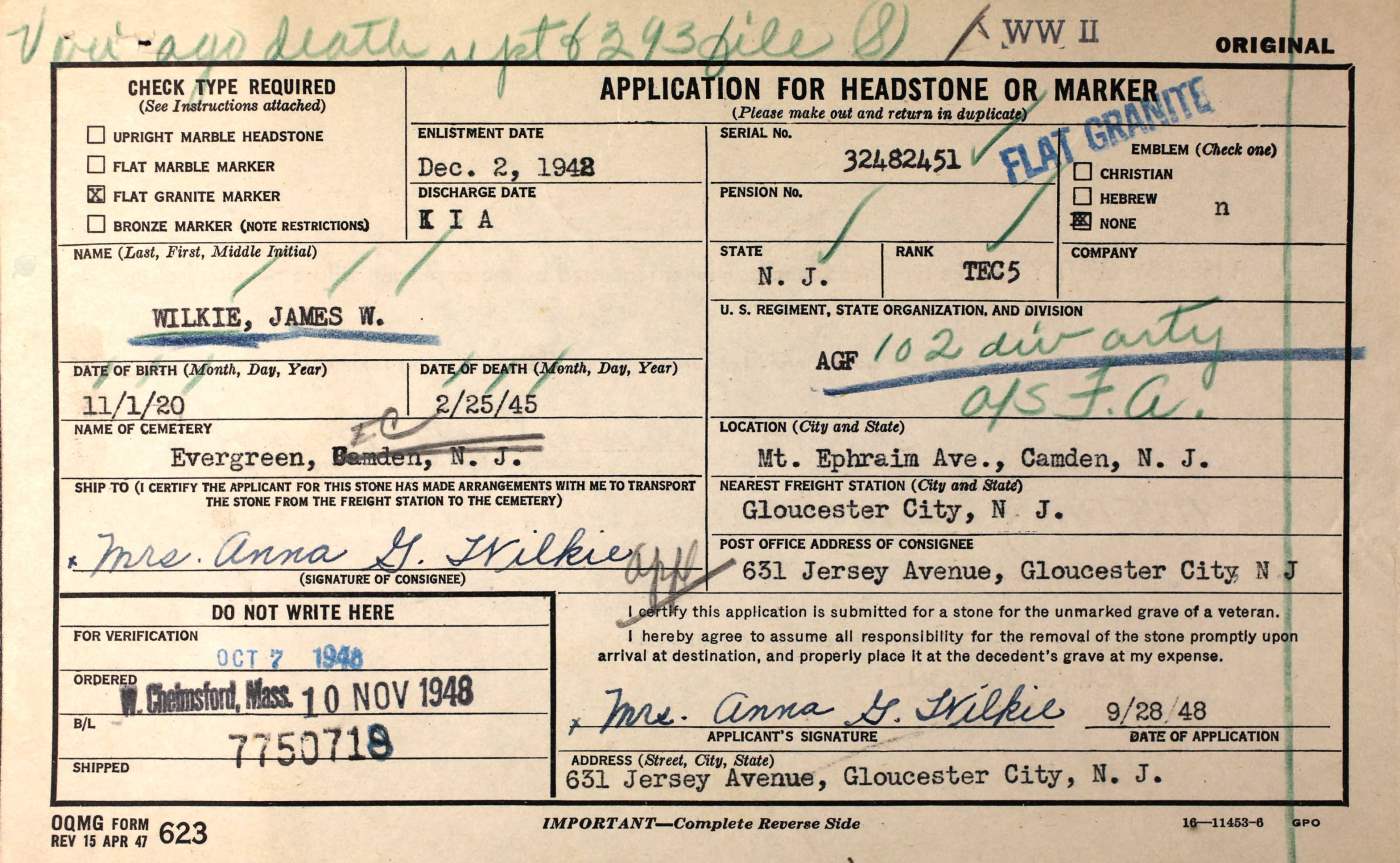 TECHNICIAN FIFTH CLASS JAMES W. WILKIE was born on November 1, 1920. He lived at 631 Jersey Avenue in Gloucester City NJ before being inducted into the United States Army on Dec ember 2, 1942. James W. Wilkie was killed in action on February 25, 1945. His death was reported in the April 2, 1945 edition of the Camden Courier-Post. James W. Wilkie was brought home to the United States after the war and was buried with military honors at Evergreen Cemetery in Camden, New Jersey. His widow, Anna G. Wilkie, never remarried, living her out her days at the Jersey Avenue address. She passed away on September 13, 2002. |