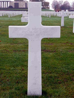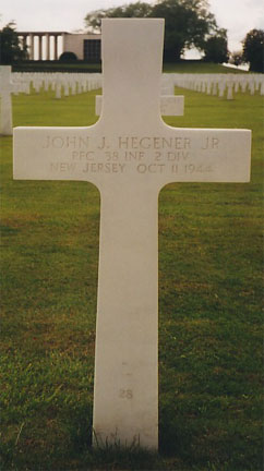 PRIVATE FIRST CLASS JOHN J. HEGENER, JR. of 830 Bergen Street was killed in action on October 11, 1944. He had entered the Army in July of 1943, and went overseas in January 1944. A graduate of St. Mary's High School in Gloucester City, he had worked as a lifeguard at Farnham, Gloucester, and Mountwell Parks in Camden County prior to entering the Army. |