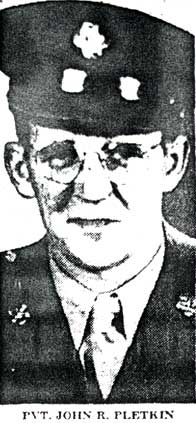 PRIVATE JOHN PLETKIN was born on July 30, 1921 to Frank J. and Anna B. Pletkin, who both had been born in Lithuania. At the time of the 1930 census the Pletkin family was living in a rented house at 1228 East Montgomery Avenue in Philadelphia PA. John Pletkin was the second child, coming between sisters Anna M. and Constance. The elder Pletkin was then working as a tailor. Before his Army service, John Pletkin made his home in Gloucester City NJ, but still had ties to Philadelphia PA, where he was inducted from on September 7, 1942. He had one year of high school and was single at the time he entered service. Suffering from an eye problem, his eye was surgically removed during his service. He was killed when the car he was in was struck by two trains in Palo Alto CA on March 22, 1945. He was brought home and buried at New St. Mary's Cemetery in Bellmawr NJ, where he now rests beside his parents and sisters. |