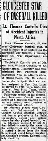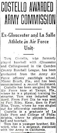 SECOND LIEUTENANT THOMAS C. COSTELLO was born in 1914 in New Jersey to William J. and Mary Costello. The second of three sons, he was bracketed by William Jr. and Edward. In 1920 the family lived at 303 New Jersey Road in the Morgan Village section of what was then Center Township, in Camden County NJ. This neighborhood was made part of the City of Camden at a later date. In 1920 William Costello Sr. worked as a clerk at a shipyard. By 1930 the family had purchased a home in adjacent Gloucester City NJ at 624 Hunter Street, and the elder Costello was working as an invoice clerk at a department store. Older brother William Jr., then 18, was working as an apprentice in lumber sales. A star baseball player in school and in the local Camden County League, Thomas Costello was a graduate of LaSalle prep and college, where he also had played baseball and basketball. He had played ball for the Gloucester and Collingswood teams in the Camden County Baseball League during the late 1930s and early 1940s. In 1938, while playing on the Collingswood team, he was a teammate of Jimmy Spillane and long-time Woodrow Wilson High School coach Grover Wearshing. Thomas Costello was working as a shipping clerk before entering the United States Army in April of 1942. Thomas Costello served initially at Fort Dix NJ, then at Fort Riley KS, and on to Fort Bliss TX, where he was chosen for flight officers' candidate school. He was sent along with over 2400 other men to Miami FL, where he was a member of Group C, Squadron 14 of the Army Air Forces Technical Training Command. He was commissioned as a Second Lieutenant at Miami FL on December 9, 1942. He was initially assigned as a physical education director, until being sent overseas as a transportation officer with the 553rd Bomber Squadron, 386th Bomber Group, Medium. Thomas Costello was killed in an accident while serving in England on June 7, 1943. He was survived by his parents and brothers. Edward was a Sergeant, stationed in California with the United States Army at the time. |