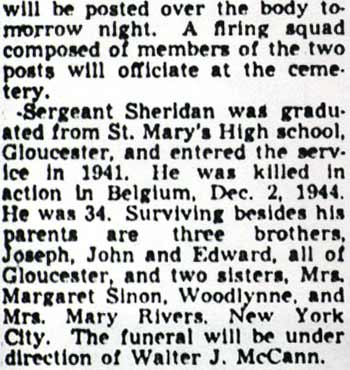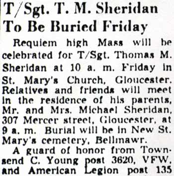 TECHNICIAN FIFTH CLASS THOMAS M. SHERIDAN, of 307 Mercer Street in Gloucester City NJ, was killed in action was killed in action in Europe on December 22, 1945. In the Army for four years, he had participated in every invasion from North Africa to Germany. Wounded in the invasion of Cherbourg, he was released from a hospital in September of 1944, when he again went into action with an infantry unit. A Requiem Mass for Thomas Sheridan was sung in St. Mary's Church in Gloucester City on February 8, 1945. He was survived by his parents, Mr. and Mrs. Michael Sheridan, and two brothers, John, who was serving with the Army in France, and Joseph, who had recently been honorably discharged from service after being injured. Thomas Sheridan was brought home to New Jersey in the fall of 1947. He was buried at New St. Mary's Cemetery in Bellmawr NJ in November of that year. |