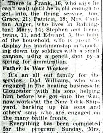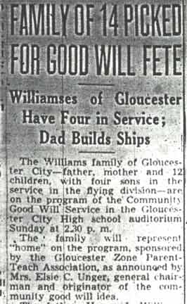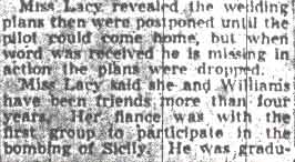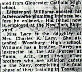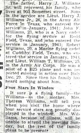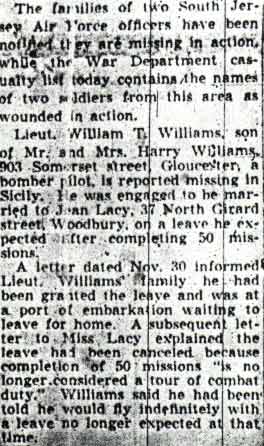 FIRST LIEUTENANT WILLIAM T. WILLIAMS born in NJ on 1919, He was the son of Mr. and Mrs. Harry J. Williams, of 903 Somerset Street, Gloucester City NJ. He grew up in Gloucester City, and was a graduate of Gloucester Catholic High School. After high school he assisted his father, who had a plumbing business. William T. Williams enlisted in the United States Army air corps on January 23, 1942 at Trenton NJ. He won his wings and received his commission, along with Frank W. White of Pennsauken NJ, at Moody Field in Valdosta GA, in January of 1943. He was the first resident of Gloucester City to qualify for flight duty. Flying B-25 Mitchell bombers with the 447th Bomber Squadron, 321st Bomber Group, Medium, William T. Williams flew numerous missions, including one against German forces in Athens, Greece, for which the 447th was awarded a Distinguished Unit Citation. The 447th Bomber Squadron moved from an airfield at Grottaglie, Italy to one at Amendola, Italy around November 25, 1943. On his 53rd mission, December 3rd, 1943, the B-25 which Lt. Williams was flying went down, killing him. Only 25 at the time of his death, he had been previously recommended for promotion to Captain. His body was recovered, and he is buried in Italy. William T. Williams was survived by his parents, four brothers serving in the Armed Forces, and his fianc�, Miss Jean Lacy, of Woodbury NJ. He was reported as missing in action, as reported in the January 14, 1944 edition of the Camden Courier-Post. His death was reported in the Courier on August 21, 1944. |