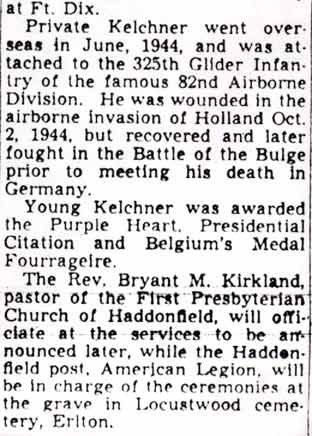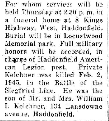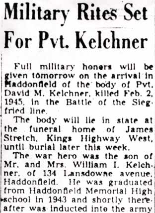 PRIVATE DAVID KELCHNER was born on June 14, 1925 to William I. and Grace Kelchner. His grandfather, Dr. William I. Kelchner Sr., was a prominent doctor in Camden NJ for many years. In 1930 William Kelchner Jr. worked as a lumber salesman, and the family lived at 28 Evergreen Avenue in Haddonfield NJ. They later moved to 134 Lansdowne Avenue in Haddonfield. David Kelchner was a 1943 graduate of Haddonfield Memorial High school, where he played football. The Camden Courier-Post reported on September 9, 1943 that he had been accepted for military service and placed in the enlisted reserve until September 24, when he, along with many others including Robert A. Caldwell of Laurel Springs, and Joseph Czempkawski of Delaware Township (Cherry Hill). David Kelchner was sent overseas on July 1, 1944. He had been wounded in Holland on October 2, 1944, and had returned to combat shortly thereafter. Private David Kelchner was killed in action in while serving in Germany on February 2, 1945 during fighting along the Siegfried Line. Private Kelchner was survived by his parents, Mr. and Mrs. William I. Kelchner. He was brought home to New Jersey in the December of 1947, and was buried at Locustwood Memorial Park in Delaware Township (present-day Cherry Hill) NJ on December 16, 1947. |