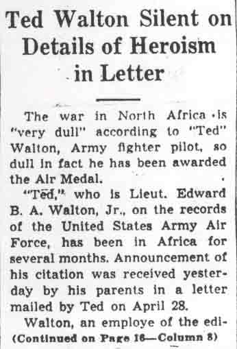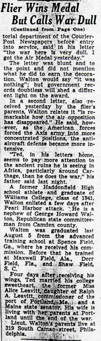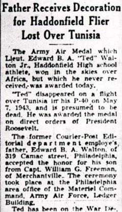 Street, Philadelphia, by the War Department. Lieutenant Walton then was assigned to Africa, flying his P-40 in the American invasion, and stories of his exploits began coming home. His uncle, a captain in the Army Air Corps, wrote of seeing the youth in North Africa, and told how "Ted" had been awarded the Air medal for directing the squadron after the commanding officer had been shot down. |