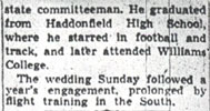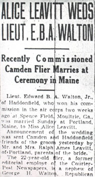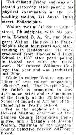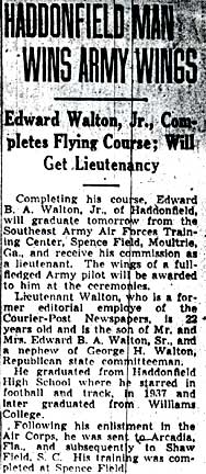 FIRST LIEUTENANT EDWARD BALDREY AUSTIN WALTON, JR. lived in Haddonfield NJ at 58 Euclid Avenue at the time of the 1930 census. He was the son of Edward B.A. Walton Sr. and his wife Margaret, and was a direct descendant of John Hart, signatory to the Declaration of Independence. The Waltons were involved in the arts, and Margaret Walton appeared in local theater as a member of the Haddonfield Alumni Players. Edward B.A. Walton Jr. was a 1937 graduate of Haddonfield (NJ) High School, where he played football and was a member of the track team. After high school he attended Williams College in Williamstown MA. Upon graduation Edward Walton took a job in the editorial department of the Camden Courier-Post newspaper. Edward Walton, known to friends and family as "Ted". He enlisted immediately after Pearl Harbor, and trained as a fighter pilot, reporting for active duty on December 27, 1941. He won his wings and commission on August 5, 1942 at the Southeast United States Army Air Force Training Center at Spence Field, Moultrie GA. Granted a leave, he married he married Miss Alice Leavitt, daughter of State Senator Ralph A. Leavitt, commissioner of the port of Portland ME, in Portland on August 9, 1942. The wedding culminated a college romance. The bride had attended Bennington College while Walton went to nearby Williams. Edward B.A. Walton, Jr. went overseas as a member of the 318th Fighter Squadron, 325th Fighter Group, flying P-40 fighter. He was lost while flying a mission in North Africa on May 7, 1943. His father, of 319 Camac Street in Philadelphia PA, received the Air Medal which Lt. Walton had earned. |