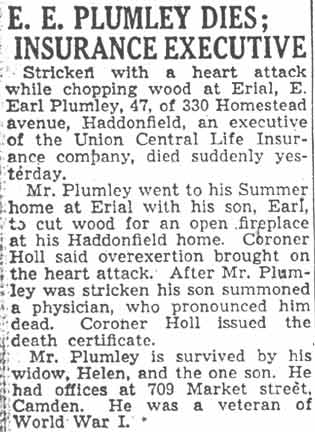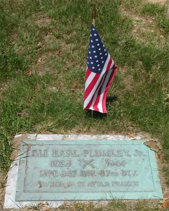 PRIVATE ELI EARL PLUMLEY, JR., was born in 1925 to Eli Earl and Helen Plumley. He had grown up in Haddonfield NJ, where the family lived at 330 Homestead Avenue. His father was an executive with the Union Central Life Insurance Company at 708 Market Street in Camden NJ, and was a veteran of World War I. On December 13, 1942 Eli Earl Plumley Sr. and Jr. went to the family�s summer cottage in Erial NJ to chop firewood. The elder Plumley, then 47 years old, suffered a fatal heart attack. Eli Earl Plumley Jr., known as Topper to his friends, completed his studies at Haddonfield Memorial High School, graduating in 1943. While at Haddonfield High he was a member of the backfield of the school football team. The family moved to 432 Maple Avenue in Collingswood NJ after the death of the elder Plumley. Eli Earl Plumley Jr. joined the Army right after graduation from Haddonfield High, in June of 1943. He trained with the 347th Infantry Regiment, 87th Infantry Division, and went overseas in October of 1944. The 87th went into combat on December 8th taking Fort Driant. Private Plumley was seriously wounded shortly after the division went into combat, and died of his wounds on December 19, 1944. |