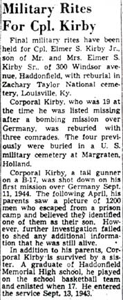 CORPORAL ELMER S. KIRBY JR., of 300 Windsor Avenue in Haddonfield NJ, was serving as a tail-gunner in a B-17 Flying Fortress bomber when his plane went down on September 11, 1944 during a raid on the oil refineries at Merseburg, Germany. Elmer Kirby was buried at Zachary Taylor National Cemetery in Louisville KY on November 15, 1949 |