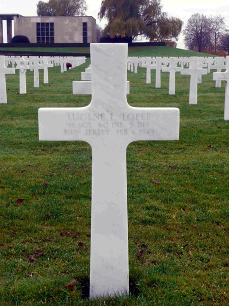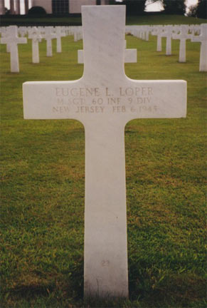 MASTER SERGEANT EUGENE LOPER, 26, of 209 Rhoades Avenue, Haddonfield NJ was killed in action on February 6, 1944. Eugene Loper had grown up in Mullica Hill NJ, and was a graduate of Glassboro (NJ) High School.. He worked in the insurance business in Philadelphia, and had lived with his aunt, Mrs. Roscoe V. Cramer in Haddonfield. He had entered the Army in 1941, and had seen action in the North African, Italian, and Normandy invasions. Besides his aunt, he is survived by his parents, Mr. and Mrs. Charles H. Rue, of 119 Palermo Avenue, Atlantic City NJ. |