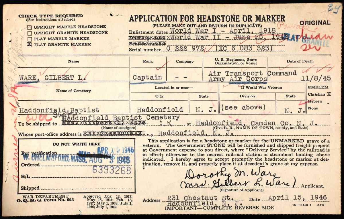 Ware. Captain Gilbert L. Ware died while serving as an officer with the United States Army's Air Transport Command on November 8, 1945. Mrs. Dorothy Ware became a charter member of the Camden County Chapter of the Gold Star Wives of World War II in November of 1947. |