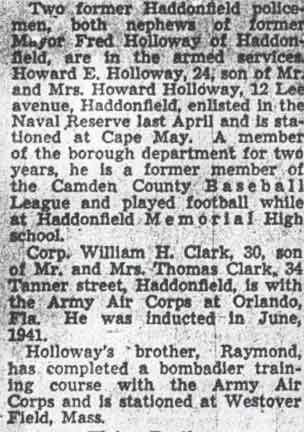 MOTOR MACHINIST'S MATE FIRST CLASS HOWARD H. HOLLOWAY was born in 1917 to Howard and Dagay Holloway. Howard Sr. was a worked as a fireman, his mother had emigrated to America from Norway in 1913. His uncle, Fred Holloway, was at one time the mayor of Haddonfield. In 1930 the family owned a home at 107 Fowler Avenue in Haddonfield NJ. Besides Howard, the oldest child, were brothers Raymond and Fred Holloway, and a sister, Evelyn. Howard Holloway Jr. attended Haddonfield Memorial High School, where he was a member of the football team. He also played baseball in the Camden County Baseball League. Prior to entering the United States Navy in April of 1942, Howard Holloway Jr. worked as a member of the Haddonfield Police Department. After entering the Navy, Howard Holloway was stationed at Cape May NJ, as of December 1942. He later went overseas. Howard H, Holloway of 24 Lees Avenue, Haddonfield NJ died of causes not related to combat while serving in the United States Navy on April 24, 1945. |