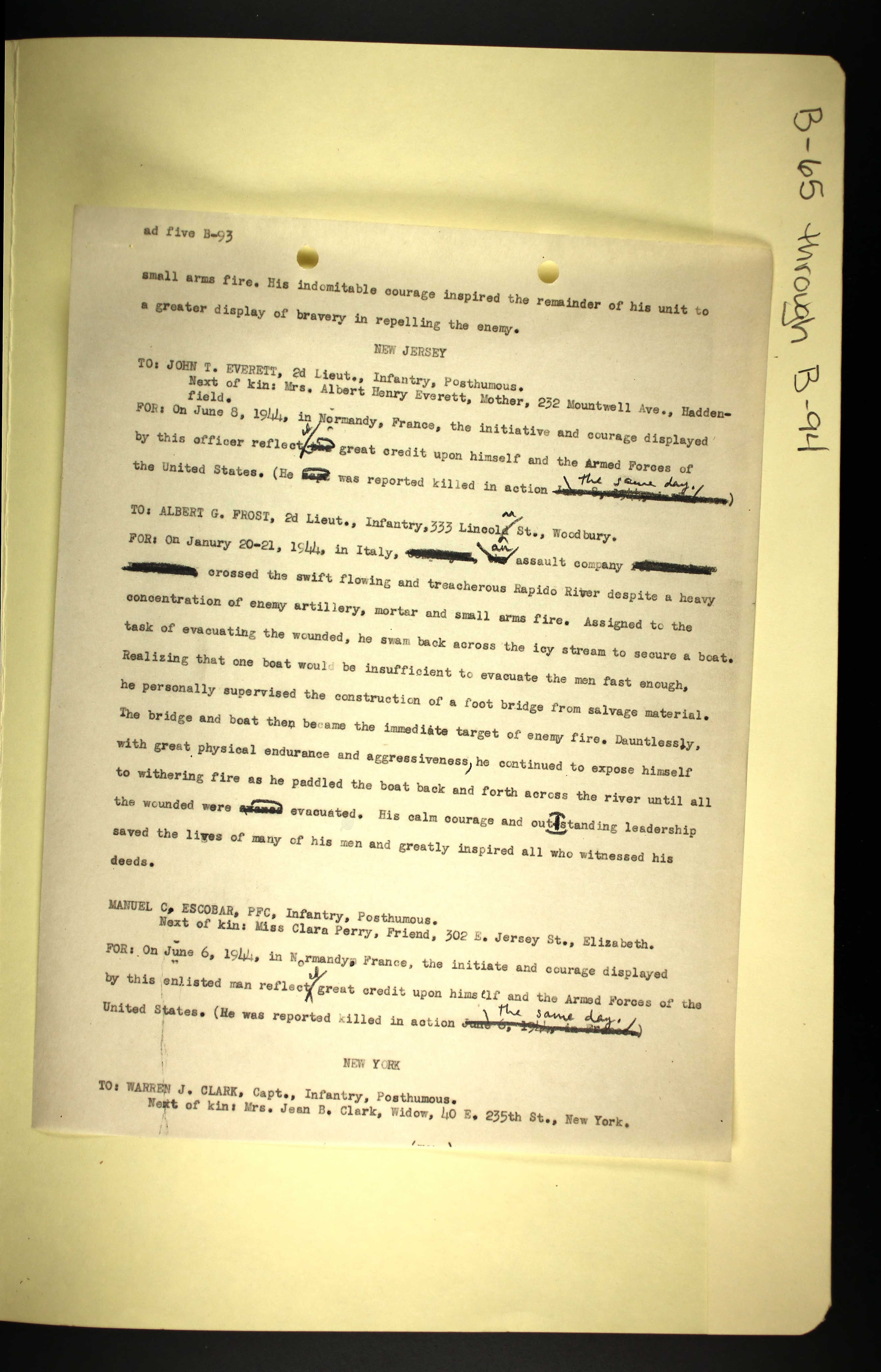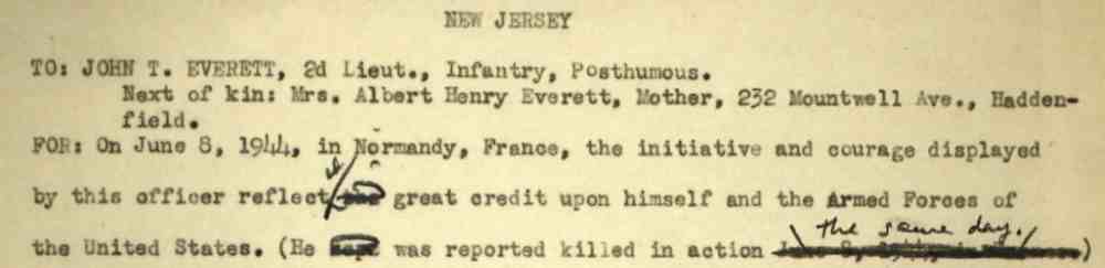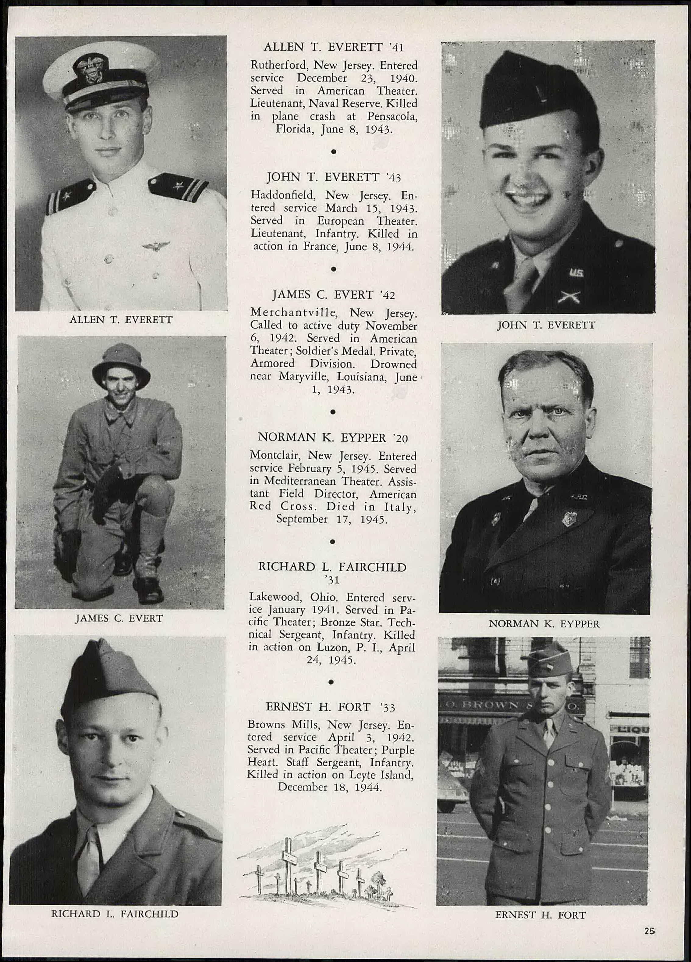 SECOND LIEUTENANT JOHN THOMAS EVERETT was born in Philadelphia PA on July 21, 1922, in Philadelphia, PA. He was the son of Mr. and Mrs. Albert H. Everett. In 1930 Mr. Everett was managing a dental company, and the family owned a home at 308 Chestnut Street in Haddonfield NJ. They later moved to 431 Washington Avenue, Haddonfield NJ. He graduated from Haddonfield Memorial High School, Haddonfield, NJ in 1938, and had been on the football team there. He entered Rutgers University in September 1939, graduating with a Bachelor of Science degree in Business in May of 1943. While at Rutgers, John was a member of Delta Kappa Epsilon, where he became secretary and eventually president. He was a member of the football team, the crew team, Targum , and the Rowing Club. In Scarlet Key, he served as both secretary and treasurer. John also acted as a Chapel Usher, Student Council secretary, and senior class vice president. He was inducted into both Crown and Scroll and Cap and Skull. John Everett entered military service on March 15, 1943, U.S. Army, and was commissioned as a 2nd Lt. on September 15, 1943. John graduated at the top of his Officer Candidate School class at Fort Benning, GA and received additional training at Fort Jackson. He served with Company E, 2nd Battalion, 12th Infantry, 4th Division during the Normandy invasion. John was killed on June 8, 1944 when he attempted to accept the surrender of a German position. The German soldiers had no intention of surrendering and fired upon him when he came in range. His unit returned fire and destroyed the position. John's commanding officer later wrote in a letter to Rutgers University that he "never served with an officer who surpassed Lt. Everett in a sense of duty and in moral and physical courage." John was awarded the Purple Heart and the Silver Star. He was initially buried in France, at the Sainte-M�re-�glise Cemetery, and his remains were brought home after the war. He was survived by his parents, and a sister, Ensign Mary Jane Everett of the United States Navy. |