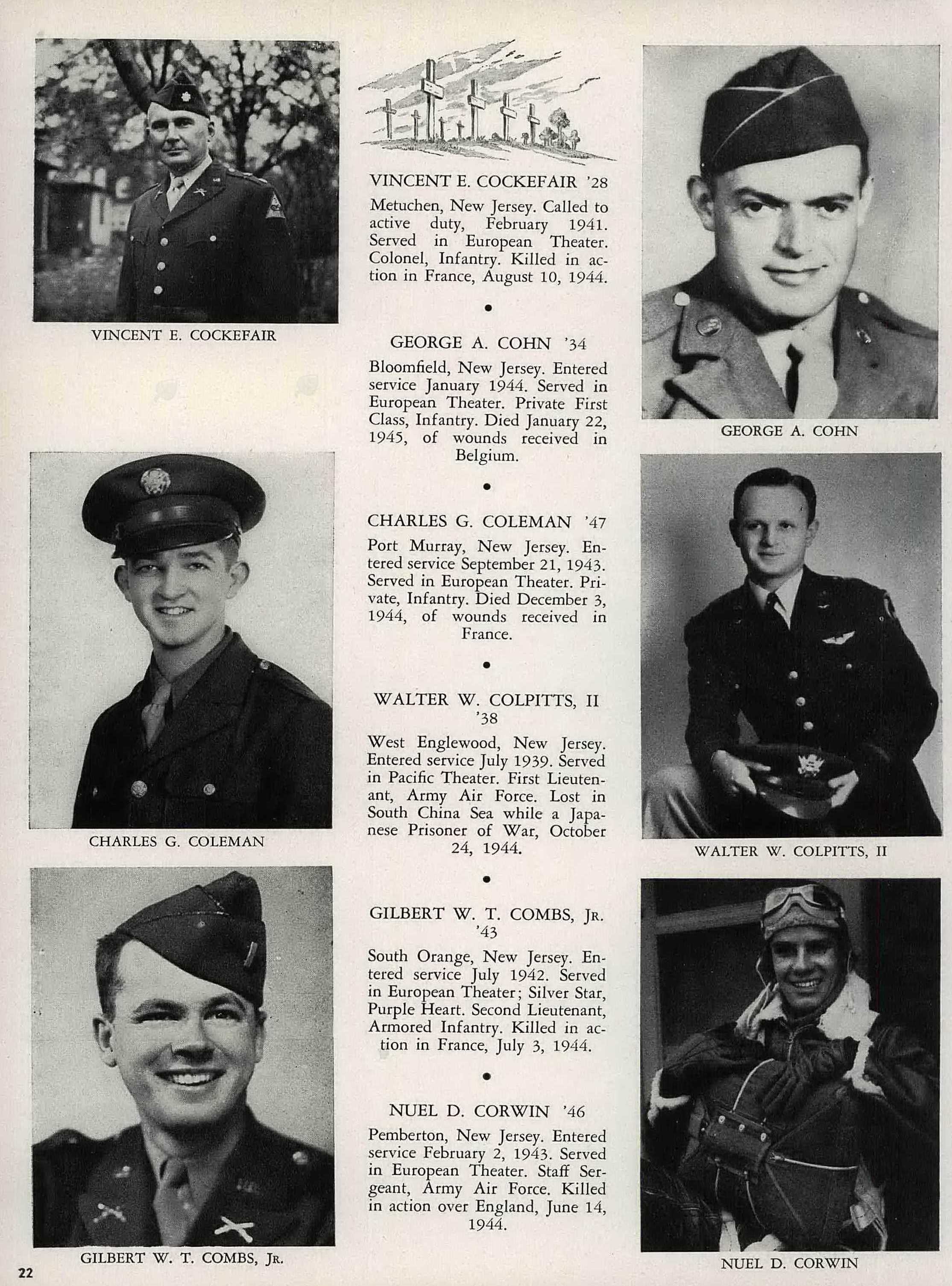 SERGEANT NUEL DINSMORE CORWIN was born in Chester Hills PA on January 27, 1924. He was the second son of Raymond W. and Ruth Belknap Corwin. In 1930 the family was living at 289 Merion Avenue in Haddonfield NJ, and Raymond Corwin was working as an engineer in the illumination industry. Nuel Corwin graduated from Haddonfield Memorial High School, Haddonfield, NJ in 1941, and entered Rutgers University in September 1942. The armed forces called him on February 2, 1943. He was assigned to the Air Corps, and trained as a ball turret gunner with the rank of Staff Sergeant, flying in a B-24 Liberator bomber, and participated in the D-Day invasion of France. He was killed in action near England on June 14, 1944. His brother, Warren Belknap Corwin, was killed in a plane crash while serving with the Army Air Force in November of that year. |