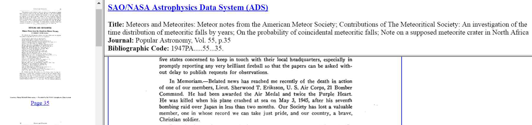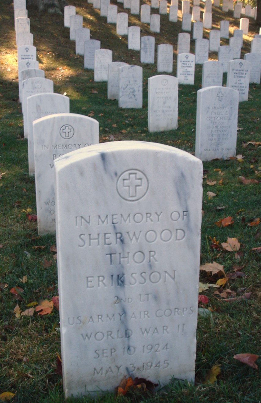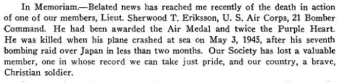 SECOND LIEUTENANT SHERWOOD THOR ERIKSSON was born on September 10, 1924 in Seattle, Washington to Gustaf Harry "Harry" Eriksso amd his wife, the forme Enid Gertrude Bell. The family moved to the Camden area shortly afterward, and a second son, Harold was born in 1927, followed by daughter Thora Belle, in 1928. The 1930 Census shows the Eriksson family living on East Cottage Avenue in Haddonfield, New Jersey. Harry Eriksson worked for an aluminum company as a supervisor. He later worked as an electrical cable supervisor for a public utility, most likely Public Service Electric and Gas Company. Sherwood T. Erikkson attended Clarkson College of Technology in Potsdam, New York. Interested in astronomy and mathematics, Sherwood T. Eriksson had been a member of the American Meteor Society. He he worked with a Professor of Mathematics at the University of Michigan to disprove the geometric axiom which states that there are an infinite number of points on a given line. After entering the United States Army, Sherwood T. Eriksson qualified for flight duty. He was trained as a radar operator on a bomber crew, and in 1944 was assigned to a crew led by First Lieutenant Robert H. Spencer Jr. The crew completed its training in the winter of 1945 and in March picked up a new B-29-55-BW Superfortress (#42-24873) and flew to Guam to joint the 28th Bomber Squadron, 19th Bomber Group, Very Heavy. The plane was given the nickname "City of Dallas". Second Lieutenant was wounded by anti-aircraft fire on his second mission, a raid on the Mitsubishi engine plant in Nagoya, Japan on April 7, 1945. On May 3, 1945, during the crew's seventh mission, the City of Dallas was hit by ant-aircraft fire. First Lieutenant Spencer ditched the plane 80 miles off the coast of Japan. When the plane hit the water the nose caved in, flooding the forward section, either trapping or killing four men. The nose went underwater so the rear of the forward section was 90 degrees, submerged to the trailing edge of the wing. The forward section sank in about 6 minutes. Lost in crash were First Lieutenant Spencer the Airplane Commander, Second Lieutenant Burl Wiley the pilot, Second Lieutenant Adolph Hechinger the Navigator, and Technical Sergeant Lynn Barnett the Flight Engineer. Of those in the rear of the plane, waist gunner Sergeant Alex Nomick was killed on impact, as was Second Lieutenant Eriksson. Radio Operator John Kimball survived the crash but was lost in the rough waters Four other crew members were rescued and survived the war. Second Lieutenant Sherwood T. Eriksson is memorialized on the Tablets of the Missing at Manila American Cemetery in Manila, Philippines and at Arlington National Cemetery in Arlington, Virginia. |