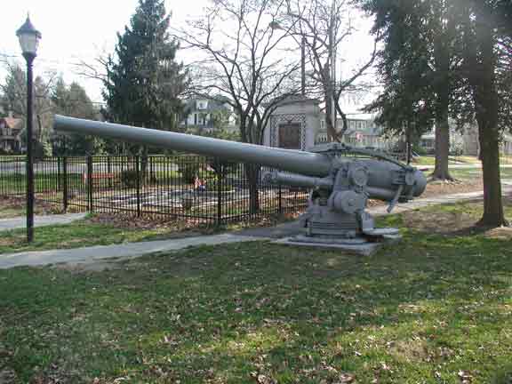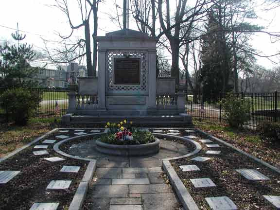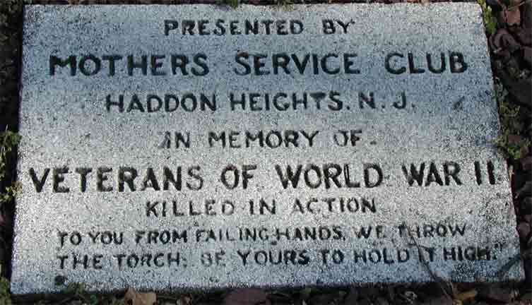 One of Camden County's finest tributes to its fallen heroes, this monument is located at the eastern end of Haddon Lake Park in Haddon Heights NJ. Besides the 2 naval guns that flank the memorial, markers were laid down with the names, years of birth and death, and branch f service of each of Haddon Heights' WWII war dead, including Richard O. Kelleher of the Merchant Marine, a branch of service that usually did not receive its due recognition. These markers were presented by the Mothers Service Club chapter of Haddon Heights. |