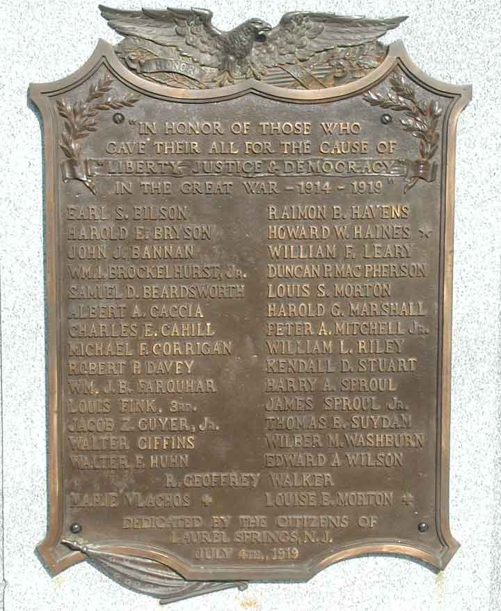 DEDICATED BY THE CITIZENS OF LAUREL SPRINGS NJ JULY 4TH 1919 |