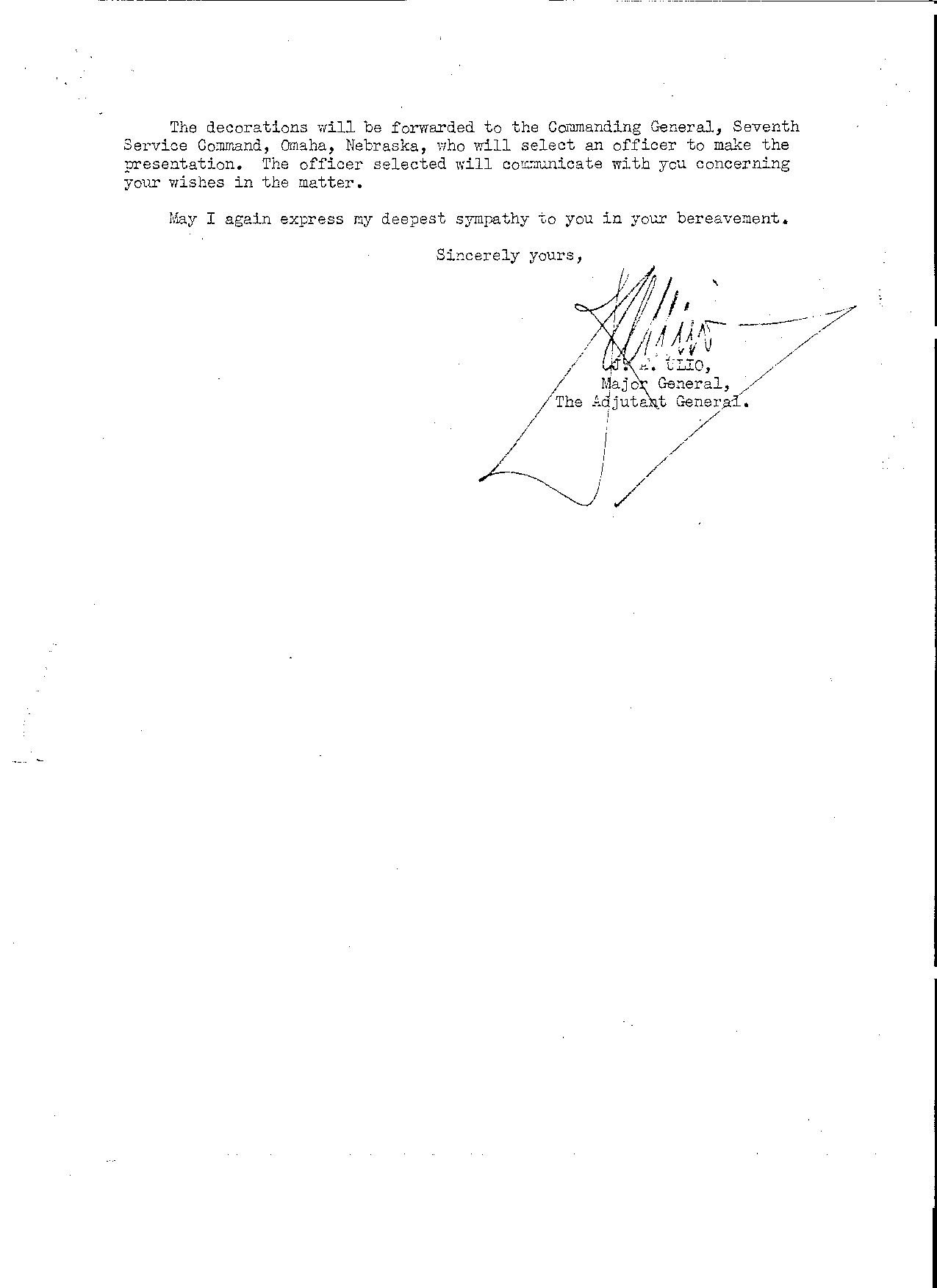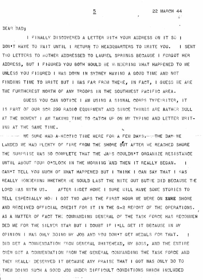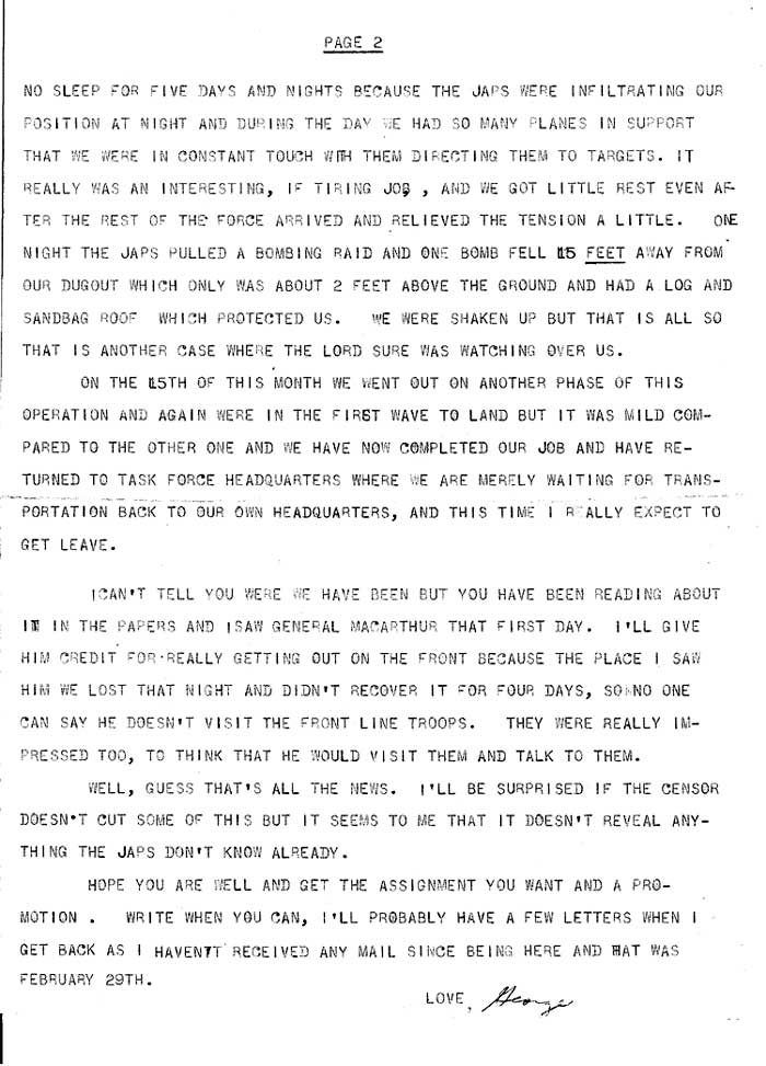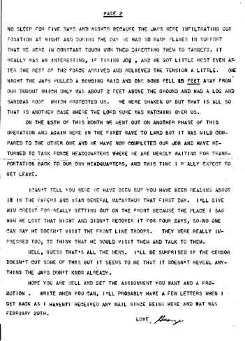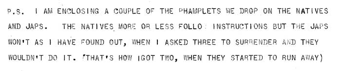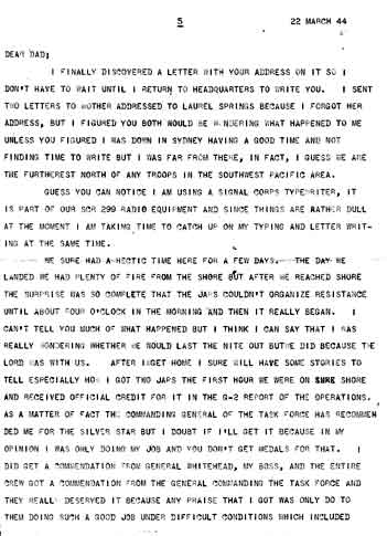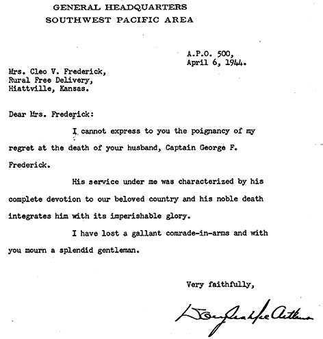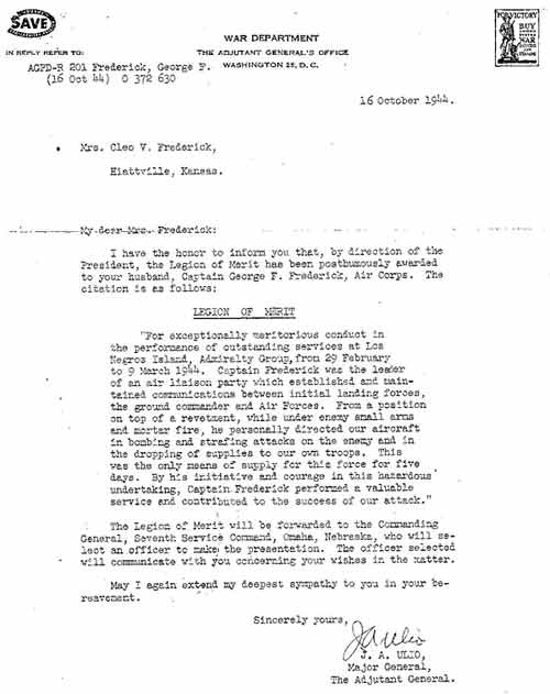 After MacArthur pulled out promising to send troops and supplies, for about four days and nights 1,000 of the 1st Cavalry held off over 4300 crack Jap troops. As air drops were the only means of bringing food and ammunition to the Americans on the beachhead, the role Captain Frederick played during this action cannot be understated. In his diary Captain Frederick wrote that the Japanese dead were piled up in front of his position three and four deep after the night attack of March 3rd, 1944. It is thought that Captain Frederick was stationed behind Troop G, which took the brunt of the Japanese counter-attack. Captain Frederick's own attitude towards his performance during this time, as evidenced in a letter home, was that he was simply doing his job. For directing air traffic while under fire from atop a revetment, he was nominated for the Silver Star, he was, however, awarded the Legion of Merit. On March 9, 1944, Major General Ennis C. Whitehead, Deputy Commander of the Fifth Air Force, wrote a note to congratulate Captain Frederick on a job well done. A testament to George Frfederick's character is his request General Whitehead that he write a similar note noting the work of his unit, the 12th Air Liaison Party. During this period Captain Frederick was in and out of foxholes and under fire from Japanese ground forces, directing air strikes in support of American ground forces. Captain Frederick was credited with killing a third Japanese soldier later in March. With a day off he went souvenir hunting. He broke into a shack and found a wounded Japanese soldier, and called for medics who evacuated injured man. The Japanese soldier died on the way to the hospital, so although he didn't wound the soldier he did get credit for taking him prisoner before he died. On March 22, 1944 George Frederick had the opportunity to use a Signal Corps typewriter and compose a letter to his father. This would prove to be his last letter home. After the Los Negros and the neighboring island of Manus fell, operations were scheduled against the outlying islands in the Admiralty chain. Amphibious assaults on the lesser islands of the Admiralties, along with mopping-up actions on Manus, comprised the last phase of combat operations. In light of the losses on Hauwei and with the expectation that landings would be opposed, attacks on the outlying islands would be made in considerable force. Pityilu Island, 3 miles north of Lugos Mission, was the first scheduled for attack on March 30, by the 1st Squadron, 7th Cavalry, reinforced (Map No. 3, pages 8-9). Pityilu Island, thought to be defended by 60 Japanese, is nearly 3 miles long and varies in width from 250 to 650 yards. The beach chosen for the assault is the only one suitable for landing; it is of white, hard sand and is located about the center of the southern shore. Six waves transported in LVT's, LCM's, and LCV's would make up the assaulting force, which would move inland through the coconut plantation covering the western two-thirds of the island. Captain Frederick accompanied the landing force to coordinate air support. Naval gunfire, artillery, and air strikes had been used against this island at various times before the attack date. Destroyers had first bombarded it to keep down hostile fire when the approaches to Lorengau and Lugos Mission were being cleared of mines. A Japanese naval gun captured on Hauwei Island had been put back into commission and used to augment the fires on Pityilu. Preparation for the attack began at 0630 on 30 March by 2 destroyers which fired 30 rounds each until 0730. A spectacular air strike followed the naval fire. For the first 10 minutes P-40's dive-bombed the landing beach; the next 10 minutes P-40's and Spitfires strafed the entire island. Immediately afterwards the 61st Field Artillery Battalion, which had registered the previous day from positions on the south side of the Lorengau air strip, pounded the island with a heavy concentration of 105's. When the artillery barrage was lifted, two LCS's (Landing Craft, Support) on either flank of the beach opened up with their rockets. By this time the assault waves were approaching the shore, and the rockets searched the island in front of the first wave. The successive waves landed unopposed and the troops established a beachhead with Troop C as the left wing, Troop A in the center, and Troop B on the right. At 1000 some patrols sent out immediately after landing reported no contact with the enemy. The Reconnaissance Platoon moved by buffalo to the west, while Troop C in reserve on the beach sent patrols west into the interior. Troops A and B, with one medium tank leading the way, began an advance east toward the rain forest which covered that end of the island. As the troops advanced they ran into light machine-gun and sniper fire which was easily silenced. Enemy guns in a hut, encountered by Troop B after moving 1,000 yards along the south coast, were neutralized by the tank, which blew up the entire position. At 1212, after progressing 1,500 yards, Troop A ran into heavy resistance from dug-in positions midway between the north and south shores. Troop A started to withdraw to permit an artillery concentration to be placed on the position, but the Japanese followed the withdrawal so closely that it was impossible to evacuate our wounded until a light tank was brought up to cover this operation. Then a 45-minute artillery concentration was placed on the enemy bunker, after which Troop A, aided by the light tank, attacked the position and killed 14 Japanese. Troop B came upon a hastily constructed trench containing 21 Japanese, who gave their position away by loud chatter. When 2d Lt. John R. Boehme and two privates went out to investigate the position, they were wounded by fire from the group. In spite of his wound, Pvt. Paul A. Lahman advanced on the position, firing clip after clip from his BAR. He was credited by Lieutenant Boehme with the destruction of practically the 