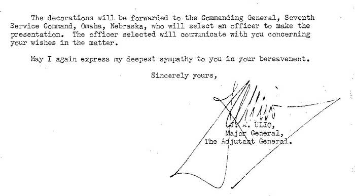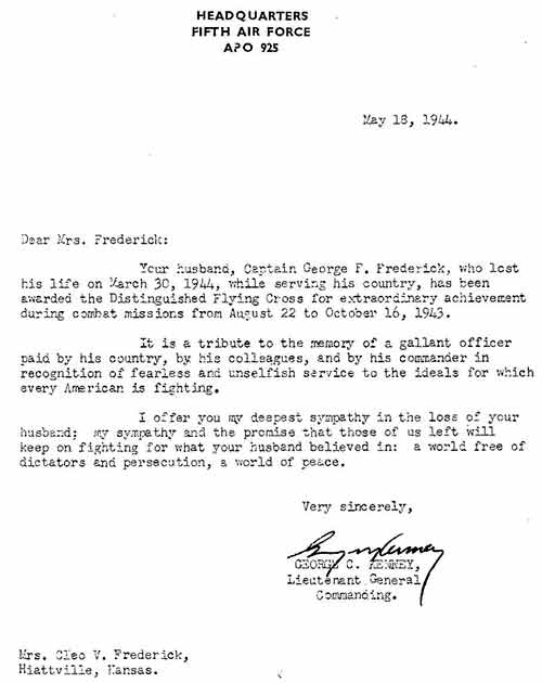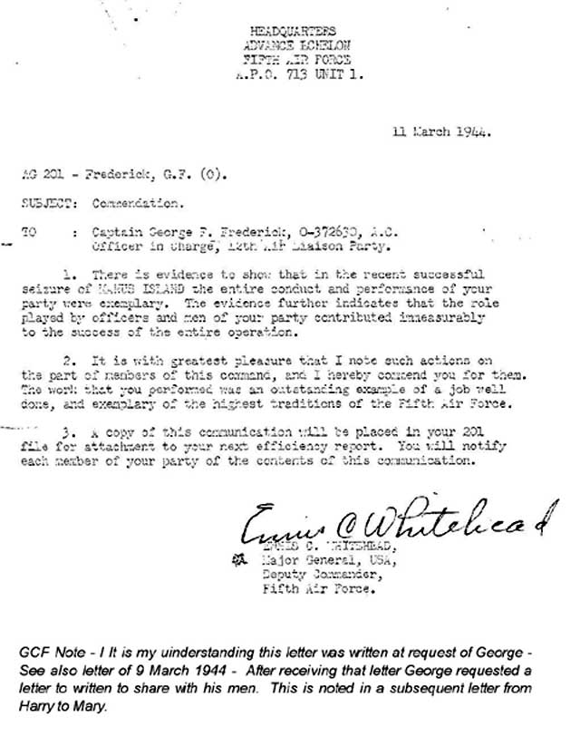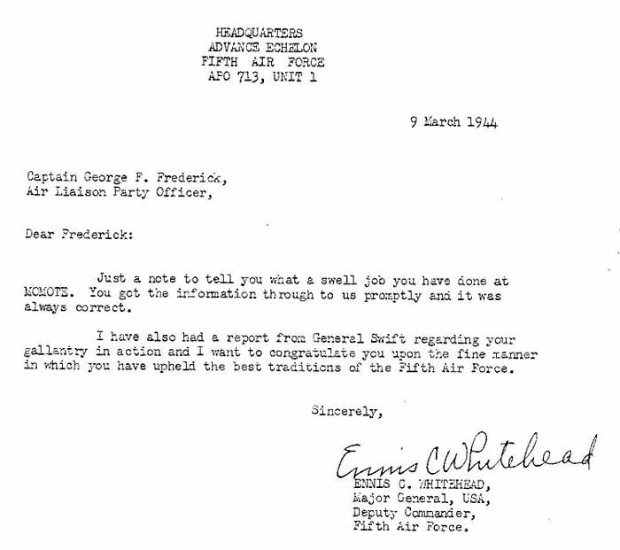 to Captain Frederick from Major General Ennis C. Whitehead, Deputy Commander of the Fifth Air Force |