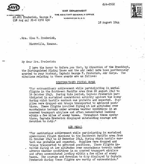 Sent to the southwest Pacific on the 1st of April, 1943, Captain Frederick was stationed for some time at Port Moresby Australia, where he served with a unit that was part of the 309th Bomber Wing. The main theater of operations in the southwest Pacific at that time was New Guinea. Captain Frederick was trained as a glider pilot, but flew reconnaissance and was assigned one point provide reconnaissance for the 3rd and 7th Australian Infantry Divisions. Begininning on August 22, 1943, piloting the unarmed Stinson L-5, a plane similar to a Piper Cub, he began flying missions in New Guinea. In early September of 1943 he aided the Australian 3rd Division during the siege of Salamua, which fell on September 11th. Attached to the Australian 7th Division, he participated in the battle for Lae, which was taken on the 16th. The Australian 7th Division continued the offensive, moving up the Markham Valley and the Ramu River, to occupy Dumpu by 4 October. Captain Frederick flew many missions in the Ramu and Markum Valleys during this period. He was was awarded the Distinguished Flying Cross for finding a usable airstrip at Dumpu and flying wounded men out of New Guinea while under enemy fire from there during this time. Captain Frederick was flying missions as late as October 16, 1943. For his deeds in August, September, and October of 1943, Captain Frederick would be awarded the Distinguished Flying Cross and the Air Medal. Heavy fighting