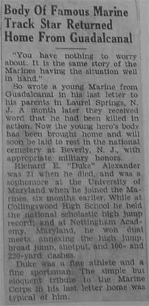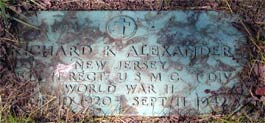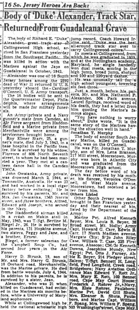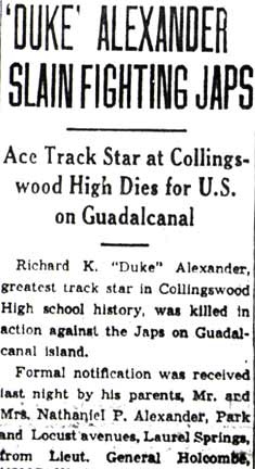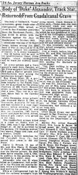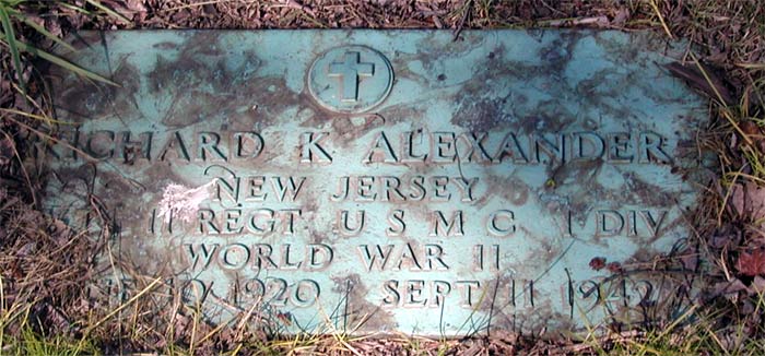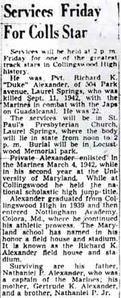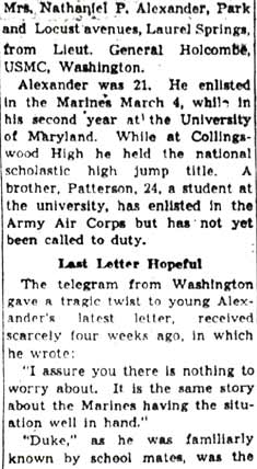 PRIVATE RICHARD E. �DUKE� ALEXANDER was the son of Nathan P. and Gertrude Alexander. Born in Pennsylvania in 1920, his father was an electrician foreman for the Reading Railroad. By 1930 the family had bought a home at 504 Park Avenue in Laurel Springs NJ. Richard Alexander graduated from Collingswood High School in 1939, where he had starred in track, and continued to excel in that sport at the University of Maryland. He left school to join the United States Marine Corps on March 4, 1942, reporting to Parris Island. He was sent to New River NC on May 4th, and went overseas to Guadalcanal on August 7, 1942, and was killed in action on September 11, at the age of 21. He received posthumously the Purple Heart, the Asiatic-Pacific Campaign Medal and a Presidential Citation. In his last letter home he wrote �You have nothing to worry about. It is the same story, the Marines having the situation well in hand� (Marine Recruiting Notes Vol. 3 #49 2/23/1948). The Knight, yearbook published by Collingswood High School, wrote "Richard K. (Duke) Alexander, died with the same "will to win" that made him the greatest track star in Collingswood's history. He lost his life while fighting with the marines on Guadalcanal." Richard Alexander was survived by his mother, Mrs. Gertrude Alexander of 504 Park Avenue, Laurel Springs NJ, and an older brother Nathan Patterson Alexander Jr.. After the war, his body was brought home, and he is buried at Locustwood Cemetery in what is now Cherry Hill NJ. |