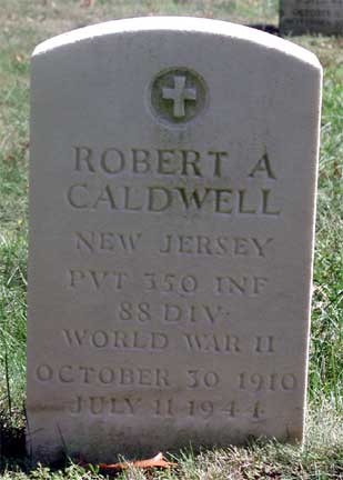 PRIVATE ROBERT A. CALDWELL was born in Pennsylvania on October 30, 1910. He was raised from an early age by his uncle and aunt, Charles C. and Sarah Caldwell. In 1920 the family was living at 7827 Buist Avenue in Philadelphia PA. The family moved to Laurel Springs sometime in the 1920s. In 1930 the Caldwell family was renting a home on East Atlantic Avenue in Laurel Springs. They later moved to 418 Walnut Avenue. At the time of the 1930 census, his uncle and cousin James were working as paper hangers, his cousin Charles Jr. was a wire weaver, and Robert Caldwell, then 19 was employed as an engraver in a novelty and buckle manufacturer. Prior to his induction into the Army in September of 1943, he had worked for the Camden County Roads Department. The Camden Courier-Post reported on September 9, 1943 that he had been accepted for military service and placed in the enlisted reserve until September 24, when he, along with many others including David Kelchner of Haddonfield, and Joseph Czempkawski of Delaware Township (Cherry Hill) reported. Private Robert Caldwell was sent overseas after 17 weeks training. He was killed in action during combat near Volterra, Italy on July 11, 1944. He was survived by his uncle and aunt, cousins Robert, James, Charles, and Lillian, and a sister, Lucy. Robert Caldwell was brought home to New Jersey after the war. He was buried at Beverly National Cemetery in Beverly NJ on July 20, 1949 |
