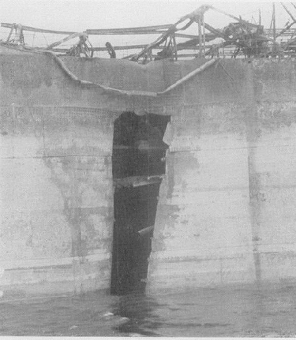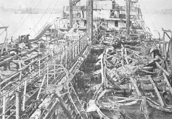 Hole in the side of the tanker J. H. Senior after collision, and Deck view of havoc wrought by fire which swept the J. H. Senior. Also deck cargo of planes was destroyed. | |