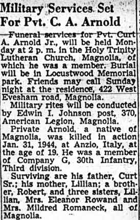inducted into the United States Army on March 9, 1943. Curt Arnold Jr. was brought home to the United States after he war, and was buried at Locustwood Cemetery in what was then Delaware Township (present-day Cherry Hill) NJ, where he now rests next to his parents and sister Lillian. |