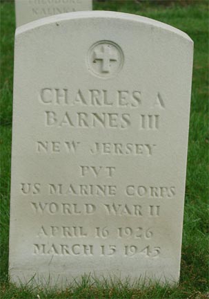 PRIVATE CHARLES A. BARNES III, was born on April 26, 1926 in New Jersey to Charles A. and Virginia Barnes. His father had served in the United States Navy during World War I. The family, which included younger siblings Kenneth and Barbara, lived in Sarasota, Florida before returning to New Jersey and settling in Merchantville. The family lived at 112 Locust Street. Charles A. Barnes attended public schools in Merchantville, and worked for a Philadelphia funeral director before entering the Marines on May 18, 1944. He is reported to have resided at 12 Clifton Avenue in Merchantville NJ before going off to the service. Private Charles A. Barnes trained at Parris Island, qualified for signal training, and was then sent to Company E, Signal Battalion, Special Training Regiment atCamp Lejeune, North Carolina. In October of 1944 he went AWOL and received 30 days confinement in return. Private Barnes was sent to San Francisco in January of 1945 to go overseas as a replacement. Private Charles A. Barnes III was wounded on February 27, 1945 and returned to action on March 3rd. He was killed in action on March 15, 1945. In 1948 he was brought home and buried at Beverly National Cemetery in Beverly, New Jersey. Charles A. Barnes III was survived by his parents, brother Kenneth, and sister Barbara. |
