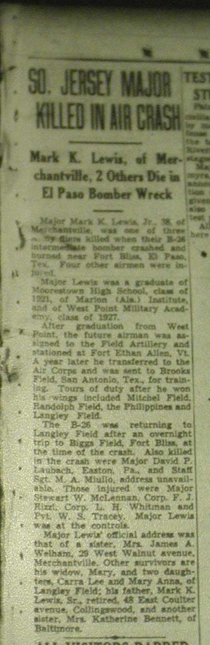 MAJOR MARK KINCAID LEWIS was born in 1902, the son of Mr. and Mrs. Mark K. Lewis. His father was the Auditor of Passenger Traffic for one of the Pennsylvania Railroad, retiring in 1935, and had also been the president of the Maple Shade NJ school board from 1922 through 1927. Major Lewis was killed when the B-26 medium bomber he was piloting in crashed on December 9, 1941 near Fort Bliss TX. Major Lewis was a 1921 graduate of Moorestown (NJ) High School, and of West Point, in the class of 1927. Memorialized on the Merchantville NJ War Memorial, he may have grown up there. His father and two sisters were living in Merchantville in 1930. He served under General Douglas MacArthur and directly under Dwight D. Eisenhower while in the Philippines, where he was responsible for training Filipino pilots and flight crews. Mark K. Lewis' off-post address was that of his sister, Mrs. James A. Welham, of 29 W. Walnut Avenue, Merchantville NJ. He was also survived by his wife, Mary, and daughters Carra Lee and Mary Anna, who lived with Major Lewis in military housing at Langley Field, Virginia; his father (who passed away on August 1, 1945) of 49 East Coulter Avenue, Collingswood NJ, and another sister, Mrs. Katherine Bennett, also of Collingswood. He was buried at Arlington National Cemetery. |