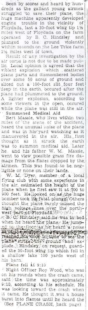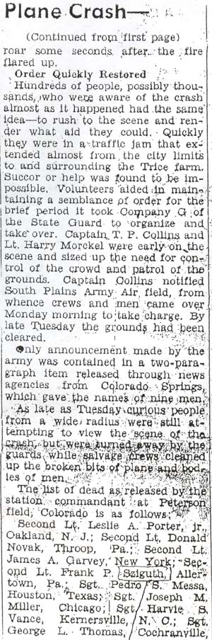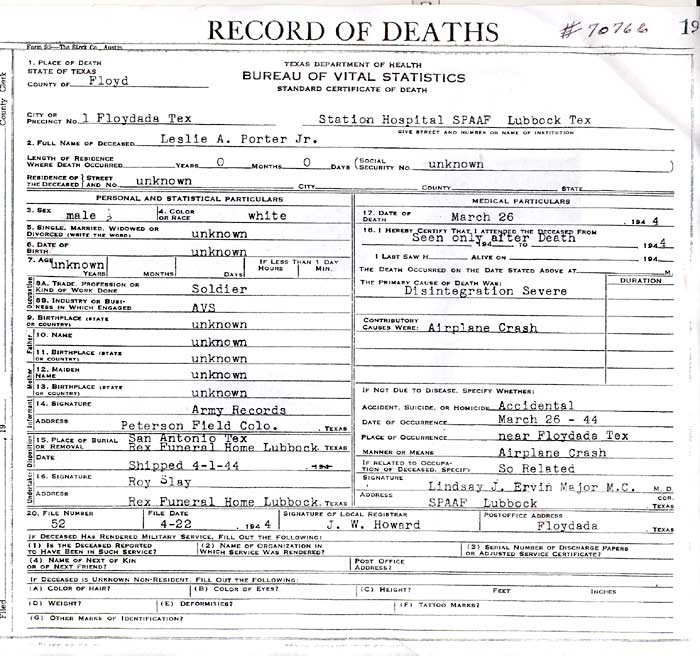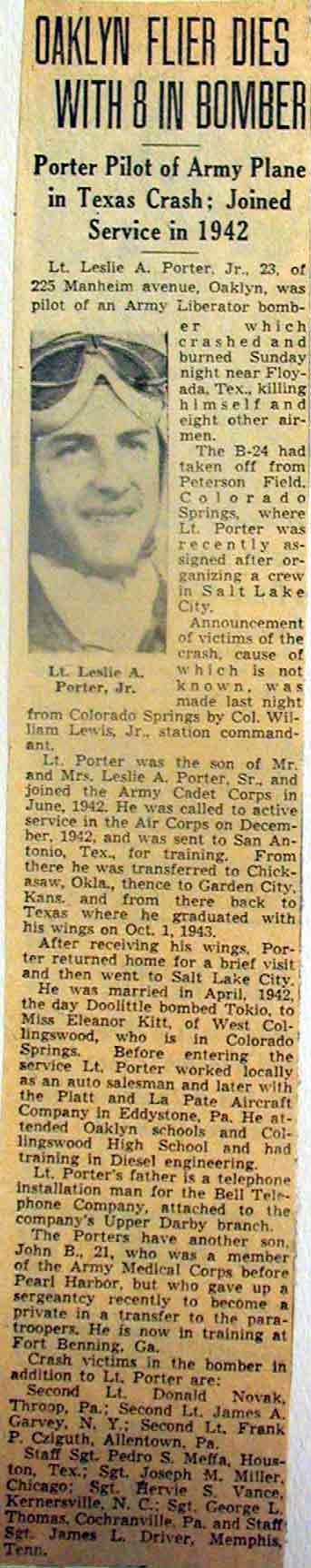 SECOND LIEUTENANT LESLIE A. PORTER JR. was born in Philadelphia PA on February 9, 1921 to Leslie A. and Elsie Porter. As of the 1930 census, his father worked as a clerk for the Bell Telephone Company, and the family included a younger brother, John. He grew up in Oaklyn NJ, where the family owned a home at 225 Manheim Avenue. A 1938 graduate of Collingswood (NJ) High School, he took part in the school plays during his junior and senior years of High School. In his yearbook, he stated that he enjoyed bowling, dancing, and driving, and disliked "English and wise guys". Leslie Porter enlisted in the Army Air Corps on June 10, 1942 and was ordered to report for active duty on December 4, 1942 He was sent to the classification center at San Antonio TX where he began his training, and was commissioned as a pilot and Second Lieutenant on October 1, 1943. He was then sent to Transition School at Fort Worth TX where he graduated as pilot of four-engine bombers. On March 26th, 1944, while on a routine formation flight from Peterson Field at Colorado Springs CO to a base in Texas, the B-24 Liberator bomber he was flying in crashed near Floydada TX. The entire crew was lost. Besides Leslie Porter, those lost included Second Lieutenant Donald Novak, Second Lieutenant James A. Garvey, Second Lieutenant Frank Cziguth, and Staff Sergeant Pedro S. Messa, Staff Sergeant James M. Driver and Sergeants James M. Miller, Harvie S. Vance, and George L. Thomas. The death of Leslie Porter was reported in the March 23,1944 evening edition of the Camden Courier-Post. On March 30, 1944 the Courier-Post reported that Leslie Porter and his crew would be buried at at Fort Sam Houston National Cemetery in San Antonio TX. On April 3rd, 1944 Leslie Porter and his crew were buried at Fort Sam Houston National Cemetery in San Antonio TX with full military honors. He was survived by his parents, his wife, the former Miss Eleanor Kipp, of Collingswood NJ, and a brother John Porter, then a private training with a parachute unit at Fort Benning GA. Memorial services were held on April 3, 1944 at the Oaklyn Baptist Church on East Bettlewood Avenue. |