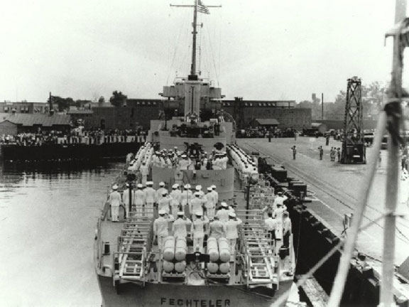 for a finance company. Between September 8, 1943 and December 31, the FECHTELER made two voyages on the key convoy route New York-Netherlands West Indies-North Africa, escorting vulnerable tankers carrying fuel and other oil products essential to modern warfare. After overhaul at New York City, she took part in experimental antisubmarine exercises in Narragansett Bay, from which she sailed February 28, 1944 for the Azores and Londonderry, North Ireland. Arriving March 6, 1944, she joined the escort of a New York-bound convoy, reaching the United States March 22. On April 1, 1944, the FECHTELER sailed from New York for Hampton Roads, where she joined a convoy for Bizerte, arriving April 22 after coming under heavy enemy air attack 2 days previous. Homeward bound, on May 5, 1944, FECHTELER was struck by a homing torpedo from the German submarine U-967 in the Western Mediterranean off Oran, Algeria. As the ship began to break in two, and sink, it was abandoned. Twenty-nine were killed, including Louis Contravo, and twenty-six wounded. USS LANING (DE-159) and other ships of the convoy rescued 186 survivors. When the FECHTELER was torpedoed, Louis Contravo's brother Eugene was also serving in the Navy. |