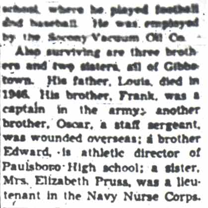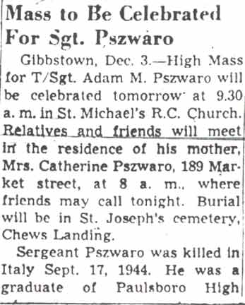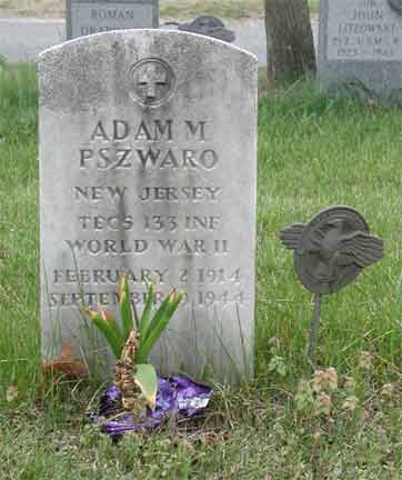 PRIVATE ADAM M. PSWARO was born in 1914 to Louis and Catherine Pswaro. He was a member of St. Joseph's Roman Catholic Church at 10th & Mechanic Street in Camden NJ. His teen years were spent in Gloucester County NJ. He was a graduate of Paulsboro (NJ) High School, where he played football and baseball. Prior to his induction into the United States Army, he worked in the research lab at the Socony-Vacuum Oil Compnay in Paulsboro, and attended night school classes at the University of Pennsylvania in Philadelphia, where he majored in chemistry. His last stateside address was 189 Market Street in Gibbsboro NJ. Trained as a medic, he was assigned to the medical detachment of the 2nd Battalion, 133rd Infantry Regiment, 34th Infantry Division. He went overseas in 1942 with this unit, first to a training base in Ireland. After continuing its training in Ireland, the 34th Infantry Division saw its first combat in the North African invasion, November 8, 1942, landing at Algiers and seizing the port and outlying airfields. Elements of the Division took part in numerous subsequent engagements in Tunisia during the Allied build-up, notably at Sened Station, Paid Pass, Sbeitla, and Fondouk Gap. In April 1943 the Division assaulted Hill 609, capturing it on May 1, 1943, and then drove through Chouigui Pass to Tebourba and Ferryville. The Division then trained for the Salerno landing. The 151st FA Bn. went in on D-day, September 9, 1943, at Salerno, while the rest of the Division followed on 25 September 25. Contacting the enemy at the Calore River, September 28, 1943, the 34th drove north to take Benevento, crossed the winding Volturno three times in October and November, assaulted Mount Patano and took one of its four peaks before being relieved, December 9, 1943. In January 1944, the Division drove into the Gustav line, took Mount Trocchio after a bitter fight, pushed across the Rapido, attacked Monastery Hill, and fought its way into Cassino, being relieved February 13, 1944. After rest and rehabilitation, it landed in the Anzio beachhead, March 25, 1944, maintaining defensive positions until the offensive of 23 May, when it broke out of the beachhead, took Cisterna, and raced to Civitavecchia and Rome. Adam Pswaro was wounded during the fighting at Anzio. After a short rest, the Division drove across the Cecina River to liberate Livorno, 19 July 1944, then moved north in the direction of Mount Belmonte. Technician 5th Class Adam M. Pswaro was killed in action on September 19, 1944 during the two-week long battle for control of Hill 810, a key point in the Gothic Line fortifications that the German army had constructed to defend northern Italy. His death was reported in the October 11, 1944 edition of the Camden Courier-Post. After the war, his body was returned to New Jersey, and he rests with other members of the military who were members of St. Joseph's Church at St. Joseph Cemetery in Gloucester City NJ. He was survived by his parents, brothers First Lieutenant Frank, Technical Sergeant Oscar, Edward, and sisters Helen and Ensign Elizabeth Pswaro, a Navy nurse. |