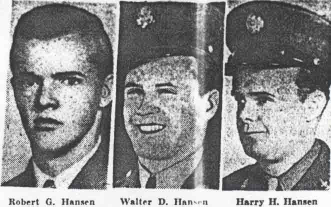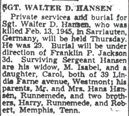 TECHNICIAN FOURTH CLASS WALTER D. HANSEN was born in 1915, the youngest of four sons of Hans and Helen Hansen, coming after William, Harry, and Robert. In 1930 the Hansen family lived on Chestnut Avenue in Runnemede NJ. Hans Hansen was a native of Denmark who came to America in 1905. He worked as a machinist at the Philadelphia Navy Yard. Walter Hansen had attended high school for four years before entering the service. He was inducted into the Army at Trenton NJ on June 2, 1941. He was serving at Camp Croft SC with an infantry unit in July of 1943. Walter D. Hansen was killed in action on February 13, 1945 near Saarlautern, Germany. Brought home in the fall of 1948, he was buried locally in a private service on December 16, 1948. He was survived by his wife, M. Isabel Hansen and daughter Carol, of 39 Lindisfarne Avenue, Westmont NJ. He also was survived by his parents, of Runnemede, and his brothers Robert and Harry.. |