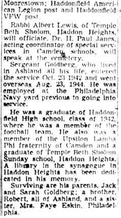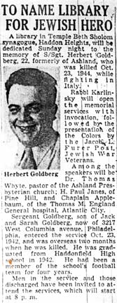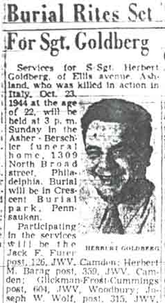 Philadelphia Navy Yard. After the war, the body of Herbert Goldberg was returned to the United States. He is buried at Crescent Burial Park in Pennsauken NJ. The library at temple Beth Sholom synagogue was named in his memory on October 28, 1945. |