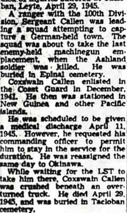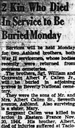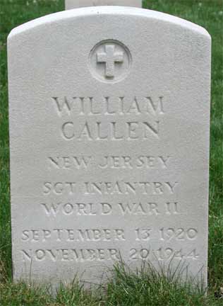 SERGEANT WILLIAM CALLEN, 23, of Camden NJ, was killed in action on November 20, 1944. He was the son of Mr. and Mrs. Albert Callen, who lived on 7th Avenue in the Ashland neighborhood on the border of Voorhees Township and what was then Delaware Township NJ. William Callen had married and was living and working in Camden NJ as an employee of the New York Shipbuilding Company. His address was reported as 28 Church Street, Camden NJ in the December 14 edition of the Camden Courier-Post, and as 416 Chambers Avenue in the January 17, 1945 edition. He had entered the Army in December of 1942. William Callen was survived by his wife Eleanor, his parents, a sister May, and a brother Albert who was serving in the Coast Guard. Albert died while in service in 1945. |