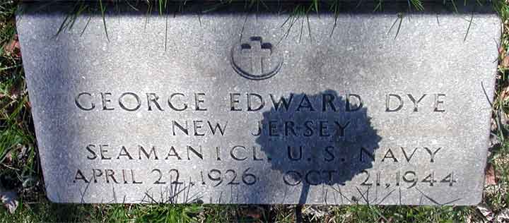 GUNNER'S MATE THIRD CLASS GEORGE E. DYE was born to Charles H. and Ruth Dye in on April 22, 1926. The family lived on County House Road in Winslow Township NJ. His parents were from Maryland, and had lived in New Jersey from at least 1920. Charles Dye had served as a Private during World War I. George Dye drowned while fighting a gasoline fire that threatened his ship in Los Angeles Harbor on October 21, 1944. Overcome by fumes from the gasoline, he fell into the water and drowned before a rescue could be made. He was 18 at the time of his death. Last a resident of Raritan Avenue in Atco, Waterford Township NJ, George Dye was survived by his parents, three brothers, and three sisters. His body was returned to NJ, where his funeral was held on November 3, 1944. He is buried in the Sicklerville Cemetery in Winslow Township NJ, where he rests with his parents. |