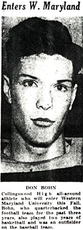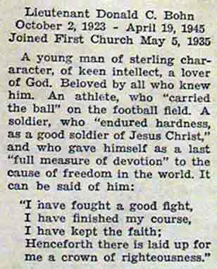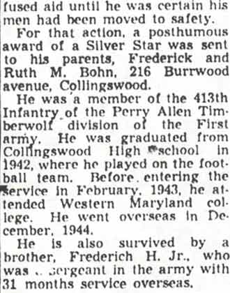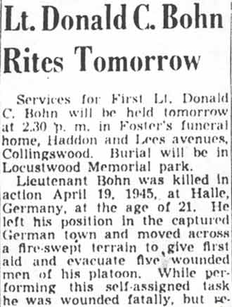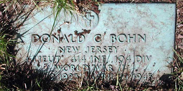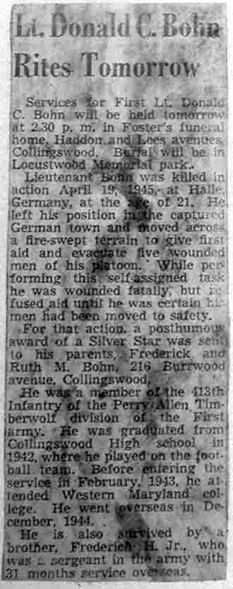FIRST LIEUTENANT DONALD C. BOHN, 21, of 216 Burwood Avenue in Westmont NJ, while serving with the 414th Infantry Regiment, 104th Infantry �Timberwolf� Division, was killed on April 19, 1945, at Halle, Germany while trying to rescue several of his wounded men. An infantry platoon leader, he voluntarily left his position and moved across a fire-swept terrain to give first aid and evacuate five wounded members of his platoon. While performing this self assigned task, he was mortally wounded, but refused treatment until he was certain that his mean had been removed to safety. He was posthumously awarded the Silver Star, and is buried in Locustwood cemetery, Cherry Hill NJ, near his parents and brother. Born October 2, 1923, he was the son of Frederick H. and Ruth M. Bohn. His father served in the Army during World War I with the 52nd Pioneer Infantry. Donald Bohn was a 1942 graduate of Collingswood High School in Collingswood NJ, and had played quarterback for the school football team there. He had attended in semester at Western Maryland College before being called to service in February of 1943. He was sent overseas in December of 1944. Donald Chant Bohn was survived by his parents and a brother Sergeant Frederick H. Bohn Jr. who had served in the Army with Company A of the 835th Engineer Battalion in North Africa and Italy for 31 months during the war. Donald Bohn was brought home after the war, and buried at Locustwood Cemetery in Delaware Township (present-day Cherry Hill) NJ, where he rests today next to his parents and brother Frederick. |