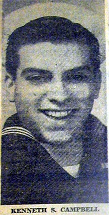 RADIOMAN FIRST CLASS KENNETH SAVILLE CAMPBELL was the son of Mr. and Mrs. Walter Edward Hall Campbell of 26 Cambridge Road, Westmont NJ, and was a 1941 graduate of Collingswood (NJ) High School. He enjoyed skating, camping and drawing. Nicknamed "Shark", he enlisted in the Navy in September of 1941, after working for a brief time for the R.M. Hollingshead Corporation in Camden NJ. His