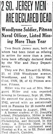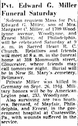 PRIVATE EDWARD G. MILLER was born in 1922 to Ernest and Margaret Miller. He had attended St. Joseph's High School in Philadelphia, and had served for 18 month in the Civilian Conservation Corps. He also worked for the Flexitallic Gasket Company in Camden NJ before enlisting into the Army in January of 1942. The Courier-Post of Camden NJ reported on Tuesday June 23, 1942 that he was serving in Panama with a coast artillery unit. He eventually served a total of 18 months of anti-aircraft duty in Panama before being sent to fight in Europe in August of 1944. He was reported as missing in action in Germany on September 26, 1944. His body was subsequently recovered, and he was reported as having his status changed to killed in action in the October 10, 1945 evening edition of the Camden Courier-Post. Edward G. Miller was survived by his parents, Mr. and Mrs. Ernest Miller of 1709 Woodlynne Avenue in Woodlynne NJ. He also was survived by brothers Ernest Jr. and Bernard, who were also serving in the Army at the time. Ernest Miller Jr. had also been badly wounded while serving overseas. |