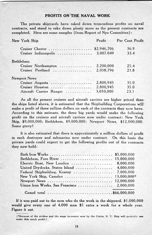 The Navy Department in 1933, hooked Congress for over 200 million dollars to build up the Navy and put men to work (they promised to put 60,000 men to work in two years, but the time is up and they haven't put more than 40,000 to work.) This money was parcelled out to the navy yards and the private yards - most of it going to the private yards. The big cor-porations got their heads together (see the Nye Committee investigation) and divided up the loot: 40 million for you, 40 million for me, and 40 million for Charlie Schwab over there. There was a lot of profit in these contracts, and still is. In 1934 they got a little more. In 1935 they got another slice. In 1936, with a war scare in Europe, the melon will be bigger and juicier.