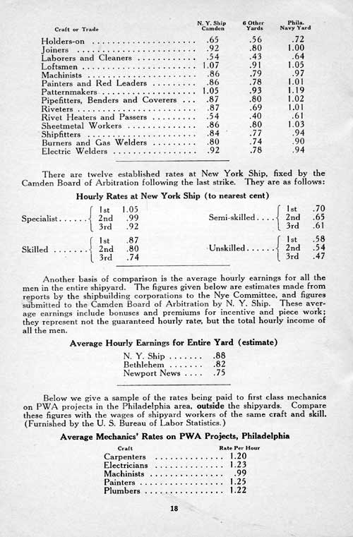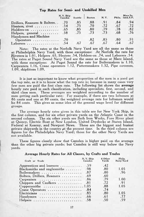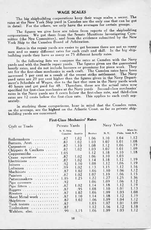 Today the mechanic in the shipyard gets 20 or 30 cents less per hour than the mechanic in building construction, and 20 or 30 cents less per hour than the mechanic in the Navy Yards, where the wages are fixed by Congress (see Appendix in back of book).