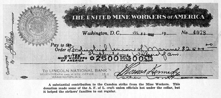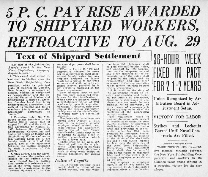 This Union agreement is now in effect in Camden. It gives us the highest average wage rates on the east coast, and conditions that no other big shipyard has. We have some protection against unfair discharges, cutting rates, transferring men, setting piece rates, etc. Prominent labor leaders throughout the country have hailed ours as one of the outstanding strikes of the year, and, with the single exception of the coal miners' strike, the most important victory for organized labor that was won in 1935.