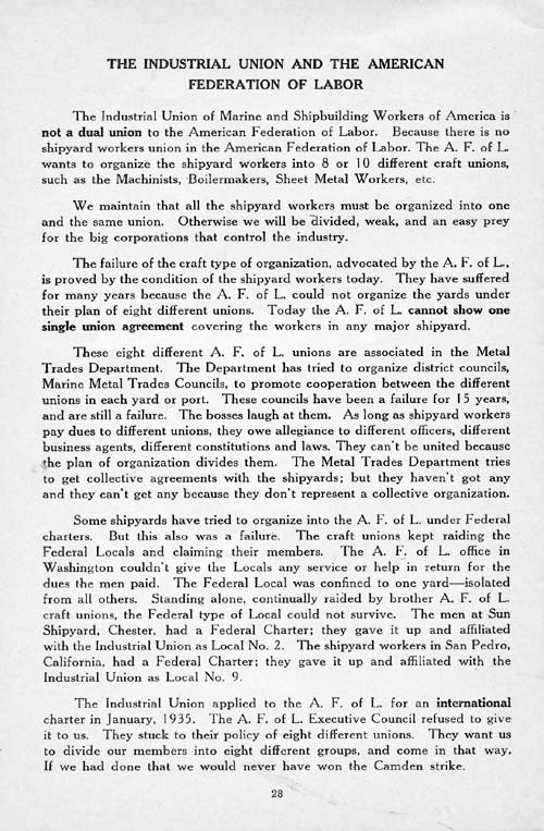 The weakness of the old A. F. of L. craft unions was that they divided the workers instead of uniting them. With a dozen different unions in the shipyard the boss could playoff one against the other. There was jealousy and rivalry between the crafts. We have learned now from bitter experience that all shipyard workers must stand together in one union and use their united strength if we are going to get anywhere.