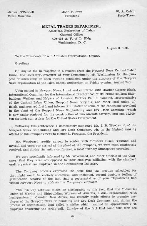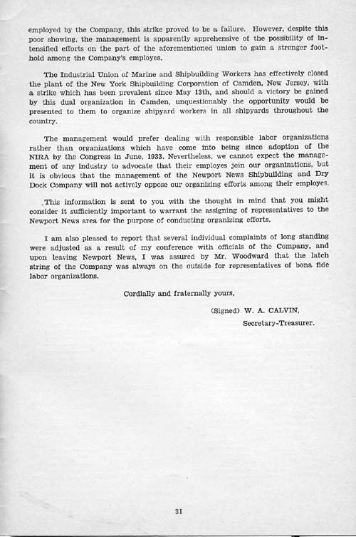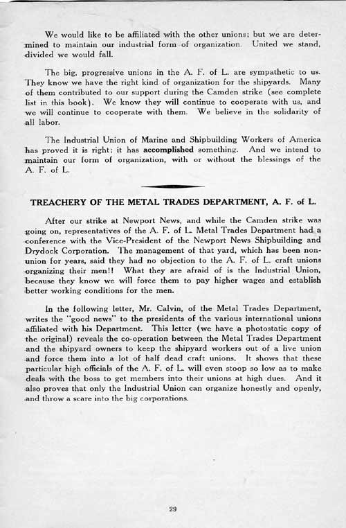 After we left Newport News the Metal Trades Department of the A. F. of L. came sneaking into town and tried to make a deal with the company on the strength of the company's fear of the Industrial Union. (See Calvin's letter in Appendix.) They made the deal with the company all right, but they couldn't organize the men, so it did them no good.