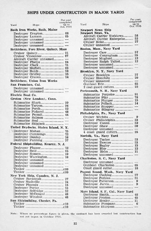 Today there is no shipbuilding in the country to speak of outside of naval shipbuilding. This is divided amongst the following shipyards (exclusive of the navy yards): Bath Iron Works, Bath, Maine; Bethlehem's Fore River Plant, Quincy, Mass.; Electric Boat Co., New London, Conn.; United Drydocks, Staten Island, N. Y.; Federal Shipbuilding, Kearny, N. J.; New York Ship, Camden, N. J.; Newport News Shipbuilding, Newport News, Va.; and Bethlehem's Union Iron Works, San Francisco. These yards are now employing 18 to 19 thousand men. There are 8 navy yards doing government building, employing 25,000 men.