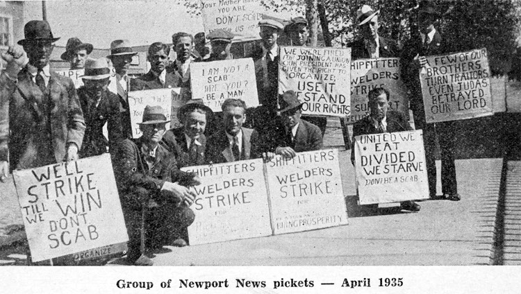 Early in April the Newport News management picked out 30 leaders of the Union and fired them out of the yard. They knew they could get away with it because the old Labor Board was dead, and the new Wagner Labor Board not born yet. We were forced to call a strike; and for three long weeks, the town of Newport News saw the first real picket line in its history. As there were close to 6000 men working there at the time, our picket line was not 'big enough to hold them out. The whole town, the bankers, merchants, lawyers, and businessmen were against us, and the company had most of its employees so terrorized that they were afraid to come out in our support. We could not get county relief for our men, and the grocers shut off their credit. Camden, with some help from the other Locals, carried the burden of paying the Newport News strikers' benefits to keep them going. But Cam-den was facing another strike of its own, and we were finally forced to call off the Newport News strike on May 8th-but with the determination to come back and organize the yard right.